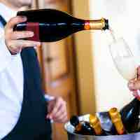 When you are ready to serve, first wipe the lip of the bottle and make sure the bottle is dry if it has been in an ice bucket. If this is a private event and you are the host, pour a small sample to taste and determine if the wine appears healthy with no off odors coming from the bottle including signs of cork taint, oxidation, etc. If you are not the host of the event, you should offer to pour the host a small sample for his or her approval. Once the champagne is deemed healthy, pour the wine for the guests or instruct waitstaff to begin pouring. Pour in a slow, steady stream. If there is foaming it is acceptable to stop while the foaming subsides and pour a second time, but in proper service, it is not acceptable to pour more than twice. If the event is such that guests are seated, each table should be approached with the females poured first in a clockwise manner from the right side and males served second in the same fashion. The host should always be served last regardless of gender.